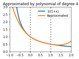 以下に例として、\(\frac{1}{1+x}\) を \(x\in[0, 1]\) に対する3次ならびに4次の最良近似多項式で表したものを示す(青が \(\frac{1}{1+x}\)、橙がそれの近似)。\(x\in[0, 1]\) ではよく近似できているものの、それ以外では離れていくということがわかる。(下記の図を作成するのに利用したPythonスクリプト)